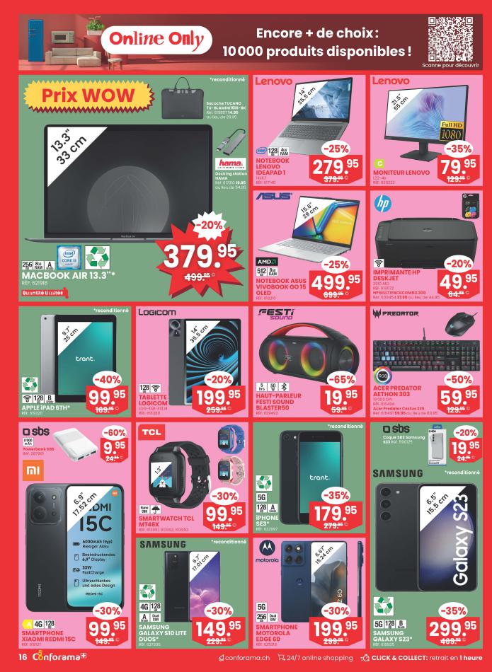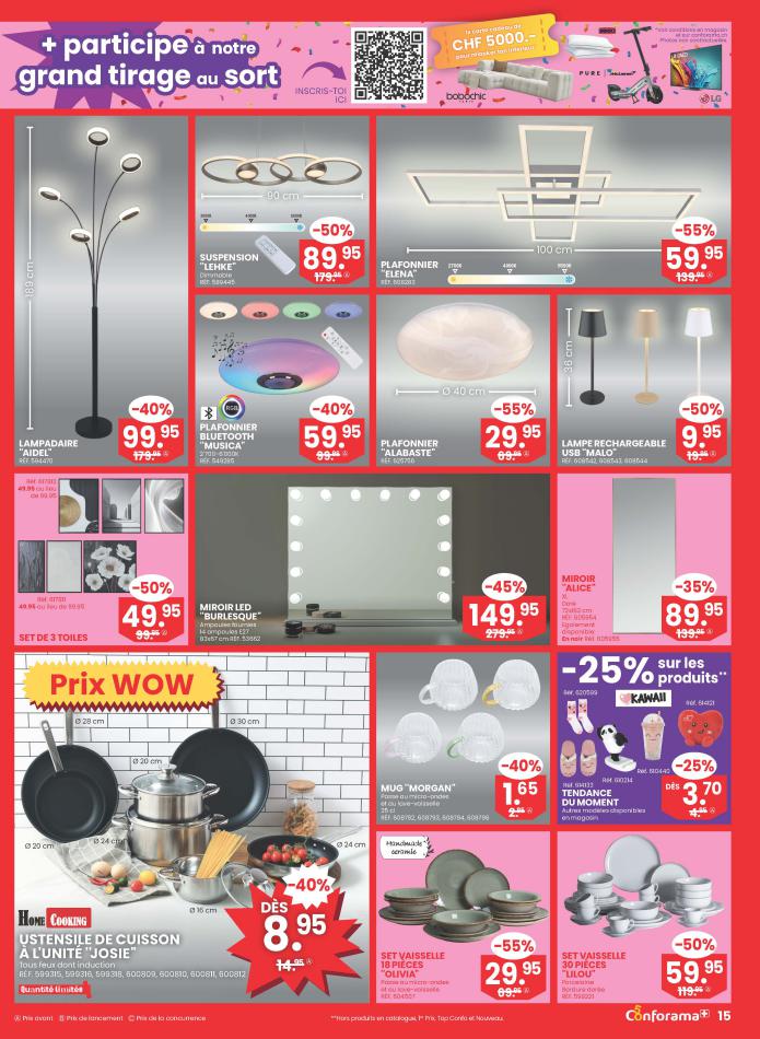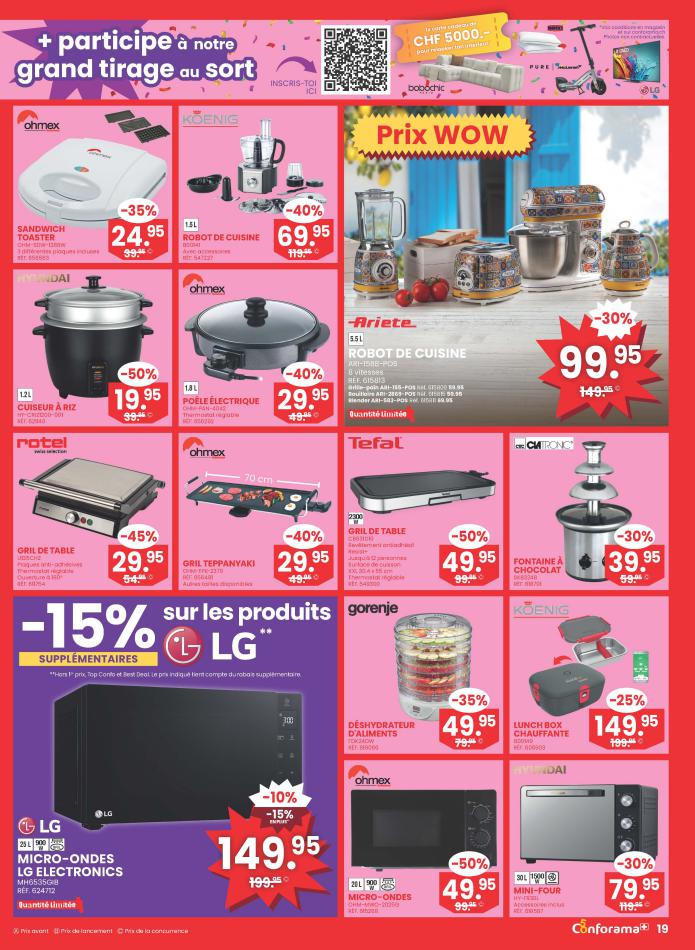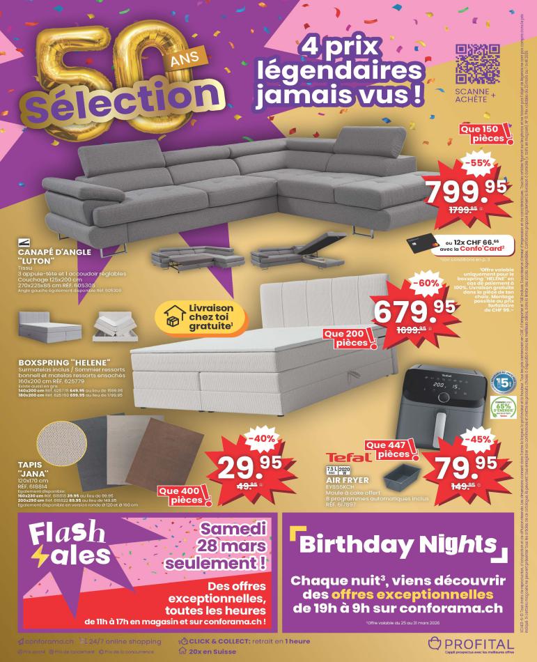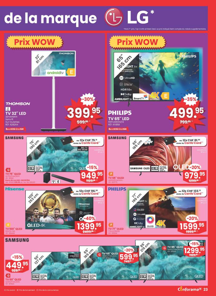 Vous trouverez ici toutes les ⚡ informations concernant les offres Conforama en cours, assortiment ainsi que horaire d'ouverture. Voir folder des promotions valable de 25 mars au 07 avril, vérifier les heures d'ouverture et adresses du réseau des magasins Conforama. Retrouvez les promotions et folders de Conforama maintenant et créez votre sélection des produits. ⚡ Ne ratez aucune bonne affaire et préparez vos achats en ligne. Faites vos économies pendant toute l'année et restez informé des dernières offres et remises chez Conforama.