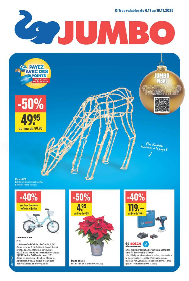 Vous trouverez ici toutes les ⚡ informations concernant les offres Jumbo en cours, assortiment ainsi que horaire d'ouverture. Voir folder des promotions valable de 06 novembre au 19 novembre, vérifier les heures d'ouverture et adresses du réseau des magasins Jumbo. Retrouvez les promotions et folders de Jumbo maintenant et créez votre sélection des produits. ⚡ Ne ratez aucune bonne affaire et préparez vos achats en ligne. Faites vos économies pendant toute l'année et restez informé des dernières offres et remises chez Jumbo.