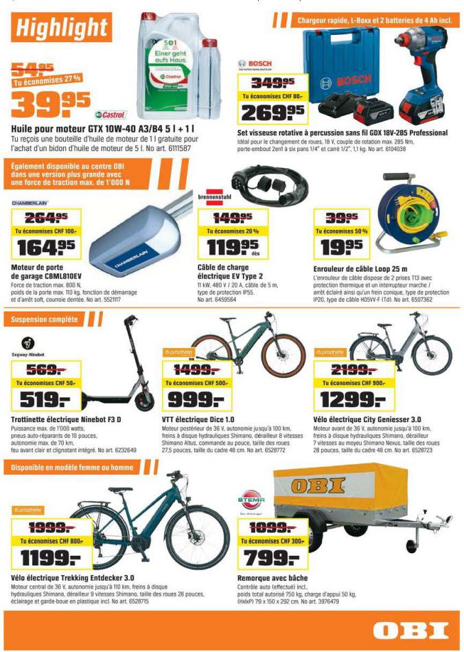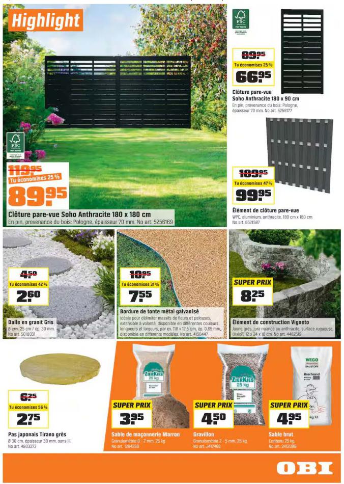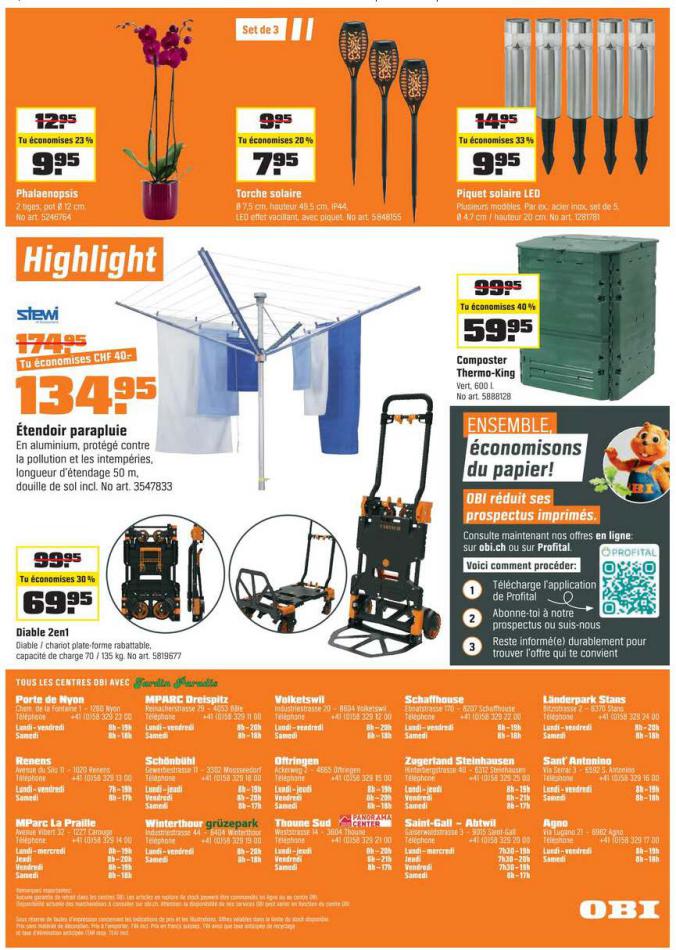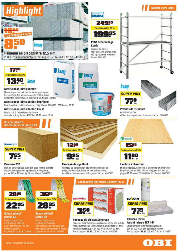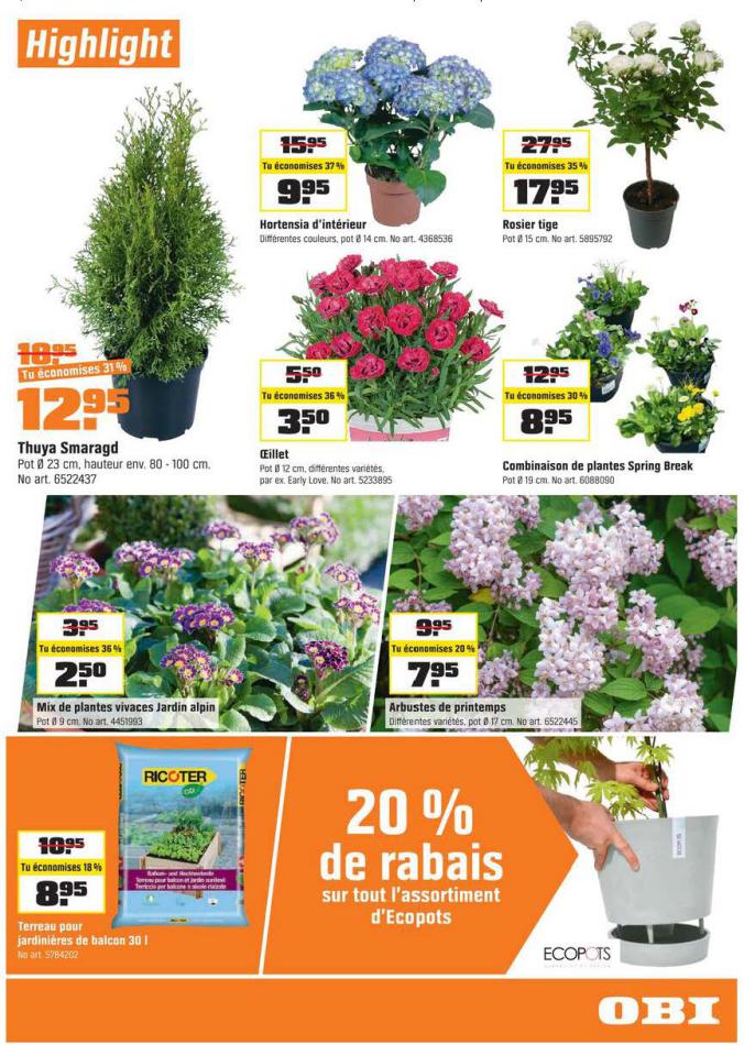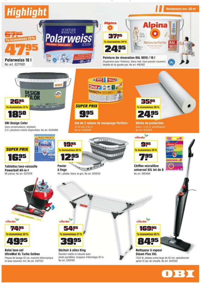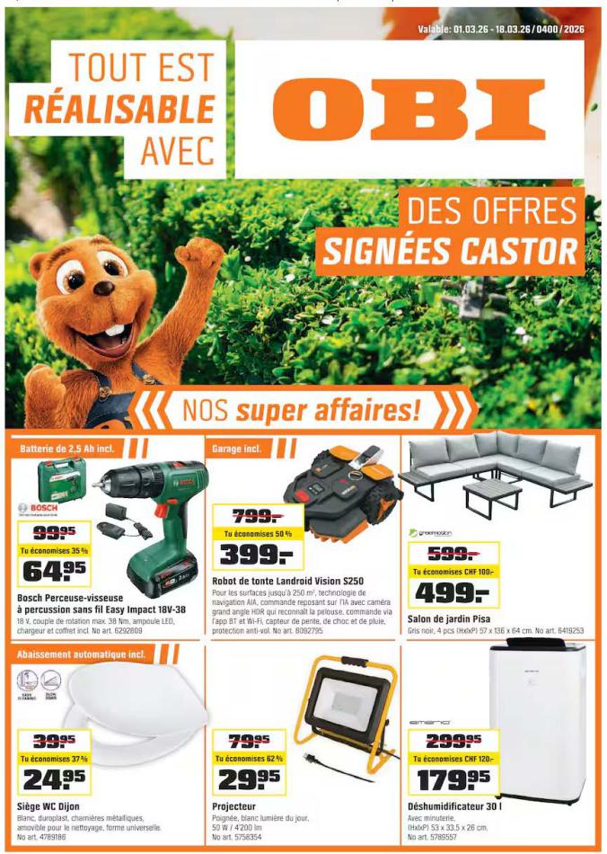 Vous trouverez ici toutes les ⚡ informations concernant les offres OBI en cours, assortiment ainsi que horaire d'ouverture. Voir folder des promotions valable de 01 mars au 18 mars, vérifier les heures d'ouverture et adresses du réseau des magasins OBI. Retrouvez les promotions et folders de OBI maintenant et créez votre sélection des produits. ⚡ Ne ratez aucune bonne affaire et préparez vos achats en ligne. Faites vos économies pendant toute l'année et restez informé des dernières offres et remises chez OBI.
