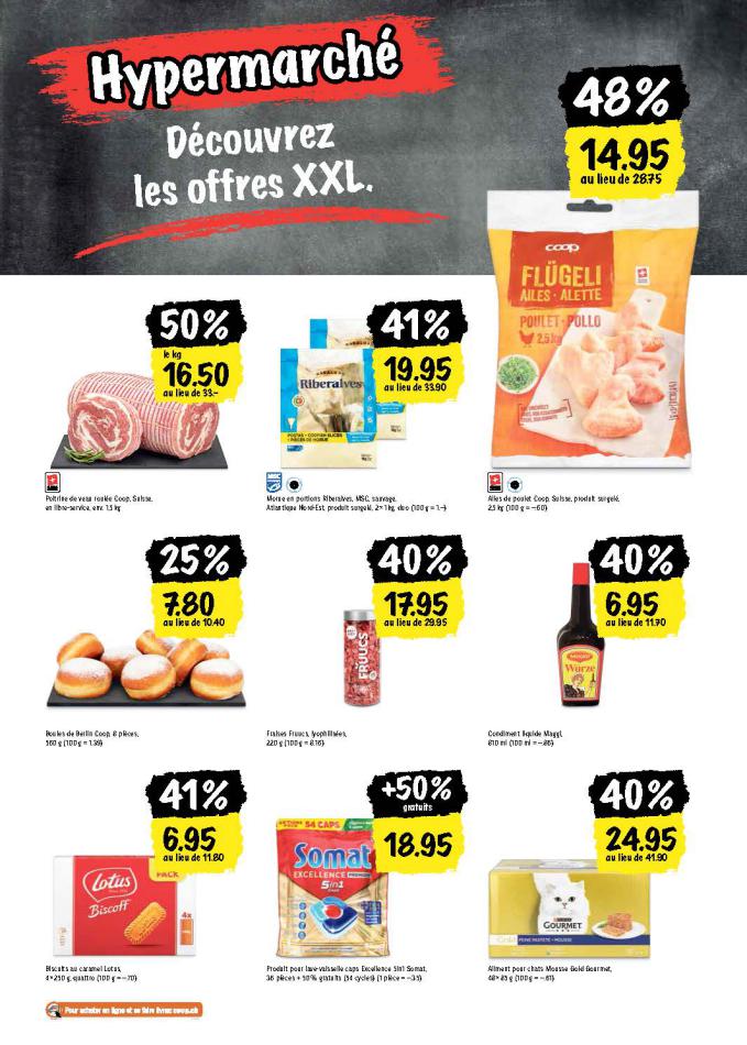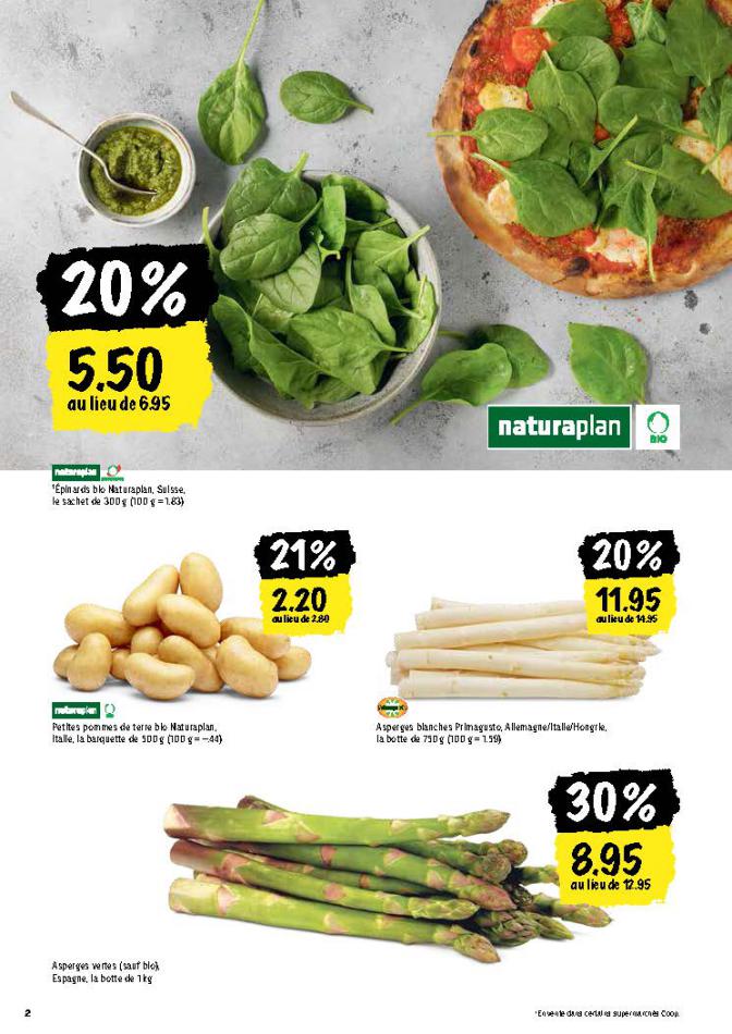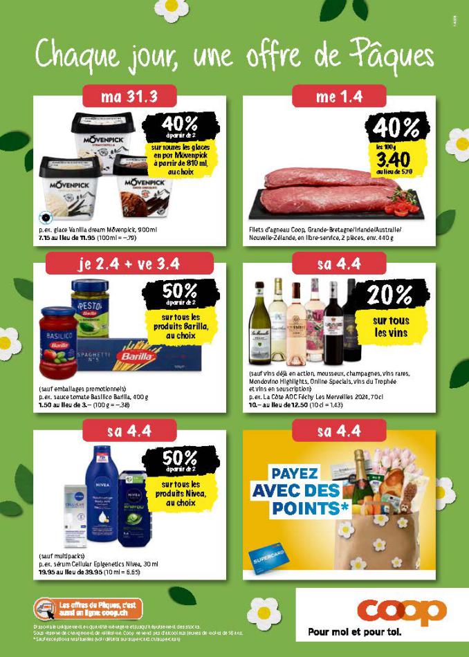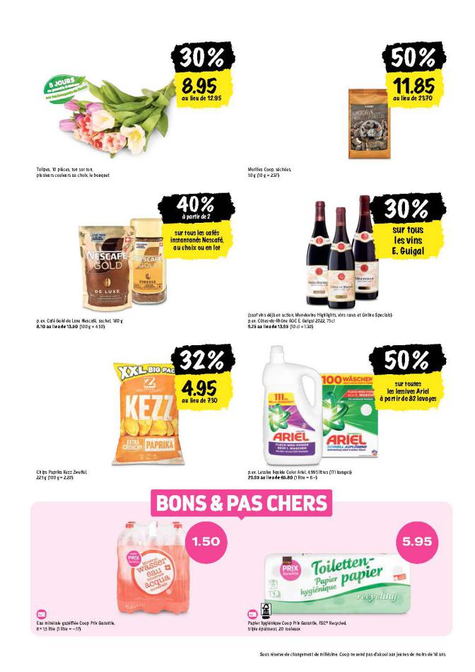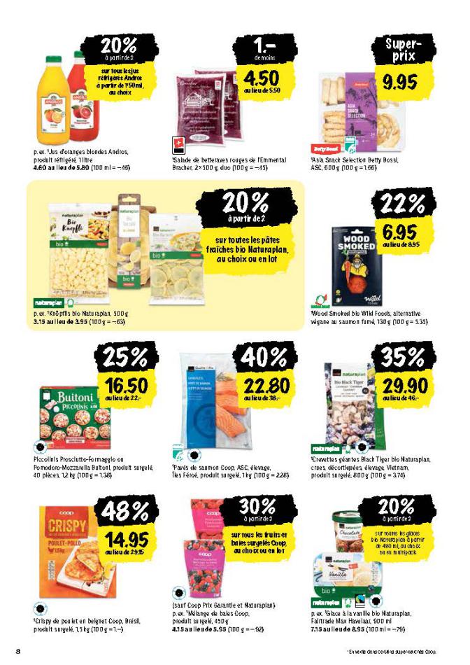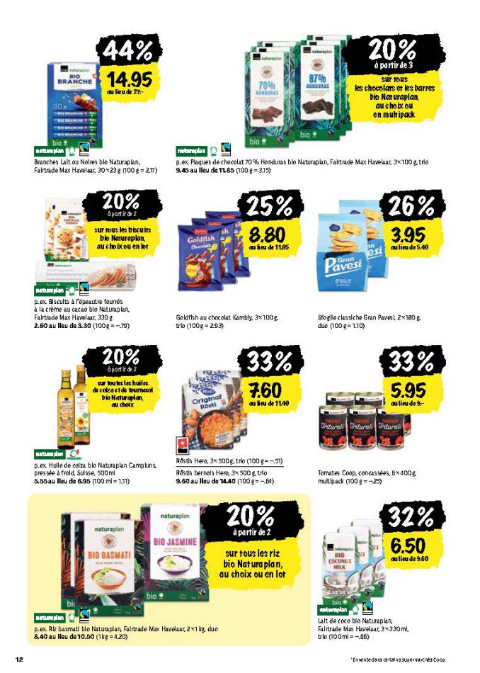 Vous trouverez ici toutes les ⚡ informations concernant les offres Coop en cours, assortiment ainsi que horaire d'ouverture. Voir folder des promotions valable de 02 avril au 08 avril, vérifier les heures d'ouverture et adresses du réseau des magasins Coop. Retrouvez les promotions et folders de Coop maintenant et créez votre sélection des produits. ⚡ Ne ratez aucune bonne affaire et préparez vos achats en ligne. Faites vos économies pendant toute l'année et restez informé des dernières offres et remises chez Coop.
