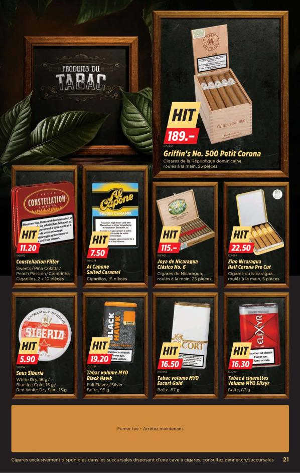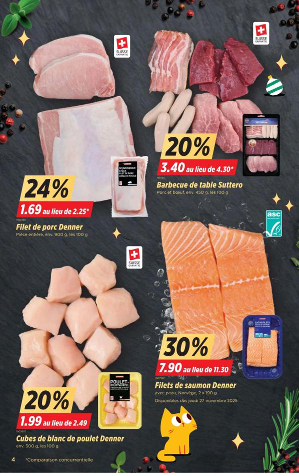 Vous trouverez ici toutes les ⚡ informations concernant les offres Denner en cours, assortiment ainsi que horaire d'ouverture. Voir folder des promotions valable de 25 novembre au 01 décembre, vérifier les heures d'ouverture et adresses du réseau des magasins Denner. Retrouvez les promotions et folders de Denner maintenant et créez votre sélection des produits. ⚡ Ne ratez aucune bonne affaire et préparez vos achats en ligne. Faites vos économies pendant toute l'année et restez informé des dernières offres et remises chez Denner.