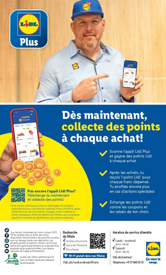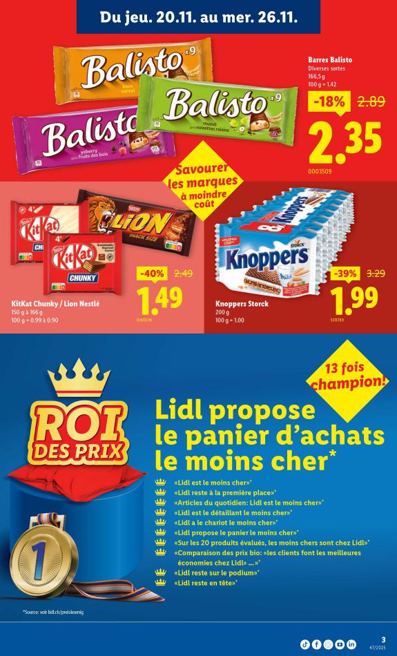 Vous trouverez ici toutes les ⚡ informations concernant les offres Lidl en cours, assortiment ainsi que horaire d'ouverture. Voir folder des promotions valable de 20 novembre au 26 novembre, vérifier les heures d'ouverture et adresses du réseau des magasins Lidl. Retrouvez les promotions et folders de Lidl maintenant et créez votre sélection des produits. ⚡ Ne ratez aucune bonne affaire et préparez vos achats en ligne. Faites vos économies pendant toute l'année et restez informé des dernières offres et remises chez Lidl.