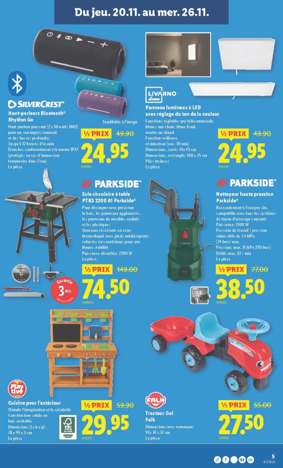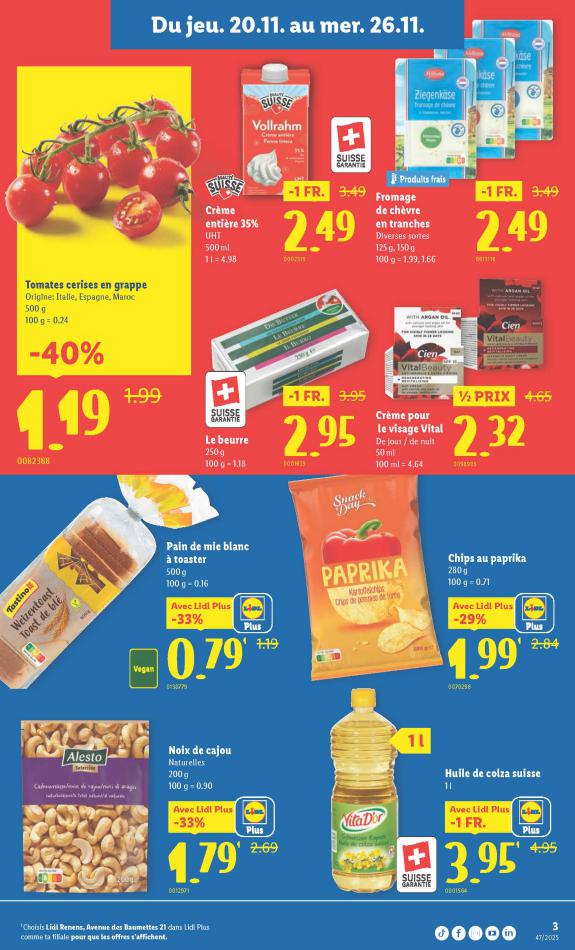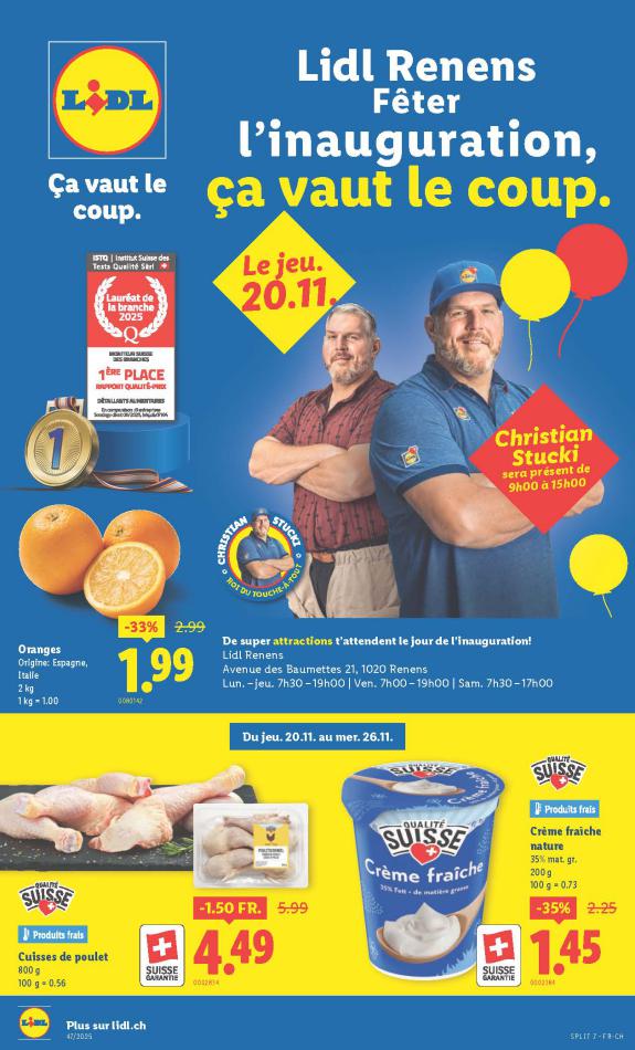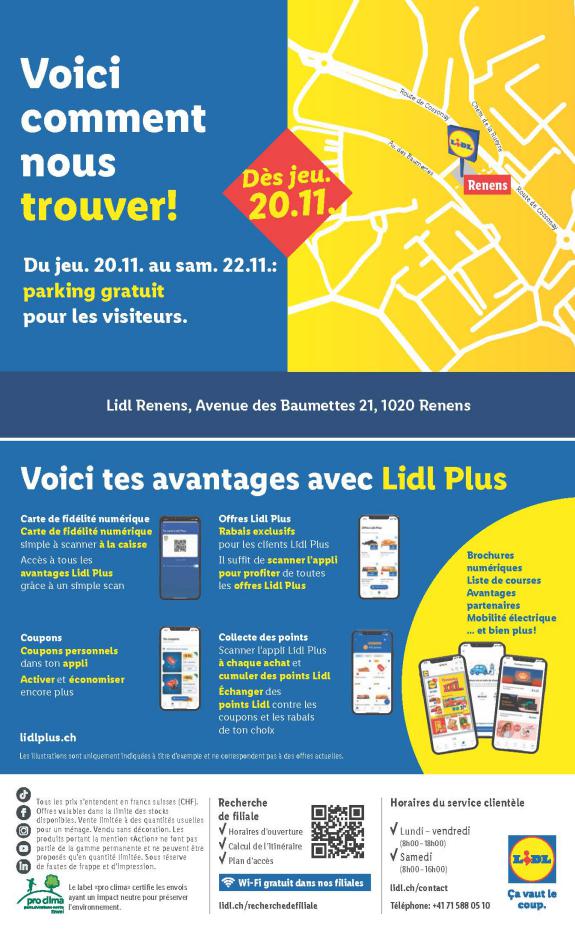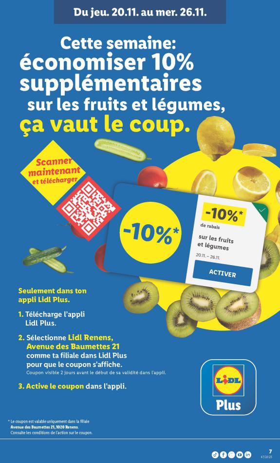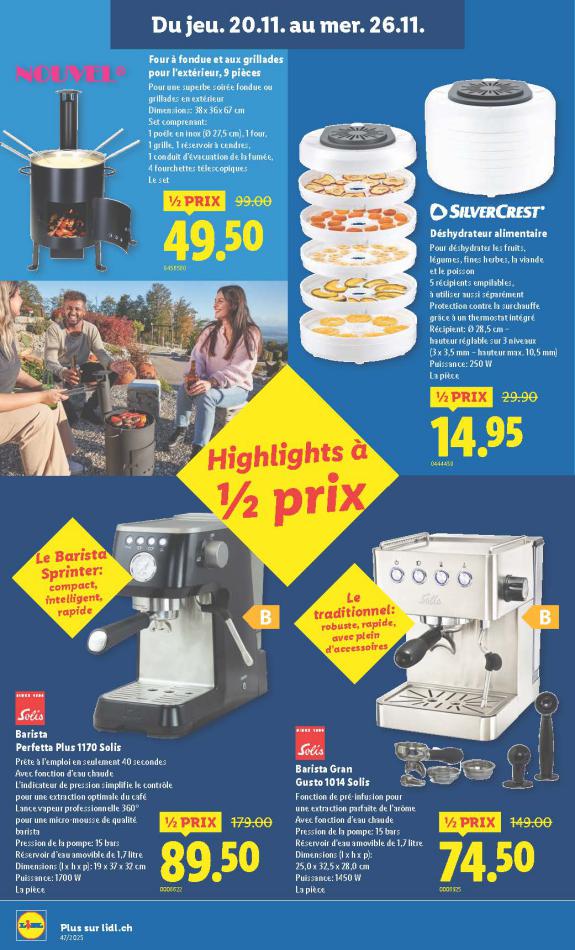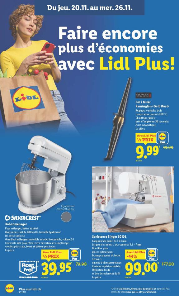 Vous trouverez ici toutes les ⚡ informations concernant les offres Lidl en cours, assortiment ainsi que horaire d'ouverture. Voir folder des promotions valable de 20 novembre au 26 novembre, vérifier les heures d'ouverture et adresses du réseau des magasins Lidl. Retrouvez les promotions et folders de Lidl maintenant et créez votre sélection des produits. ⚡ Ne ratez aucune bonne affaire et préparez vos achats en ligne. Faites vos économies pendant toute l'année et restez informé des dernières offres et remises chez Lidl.