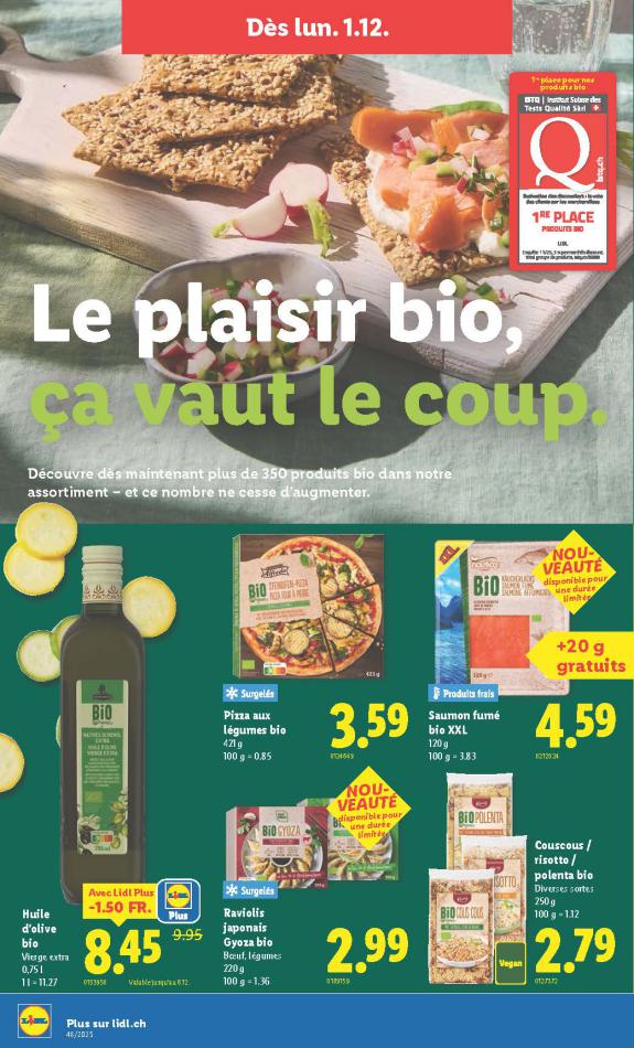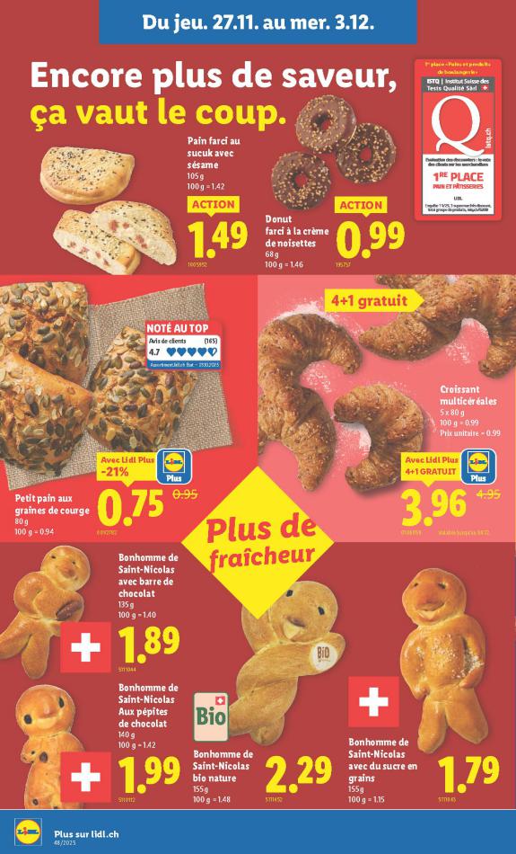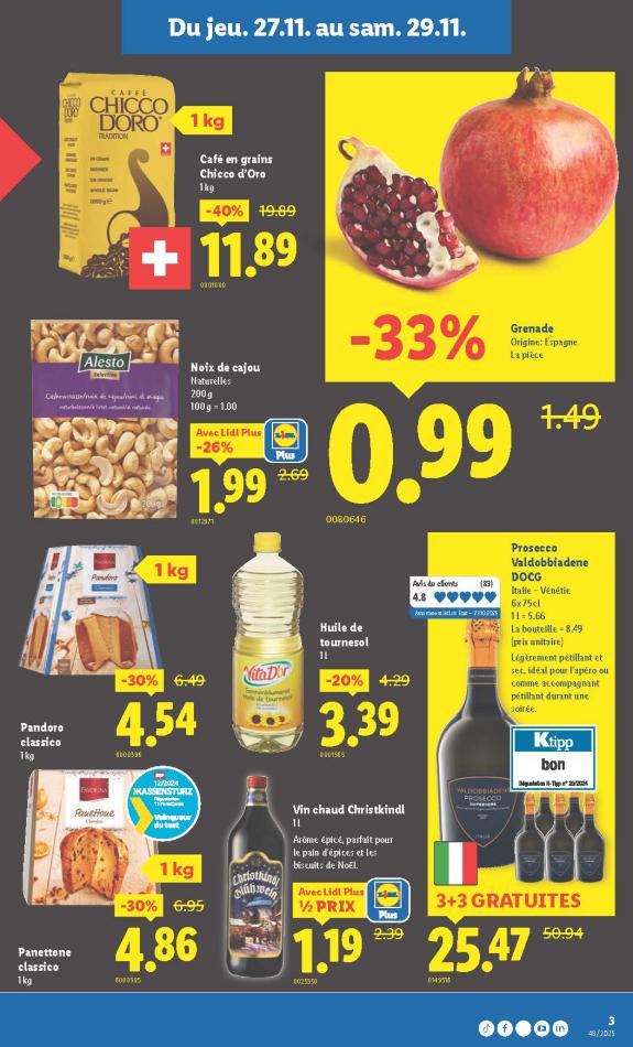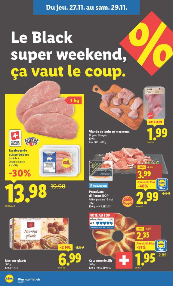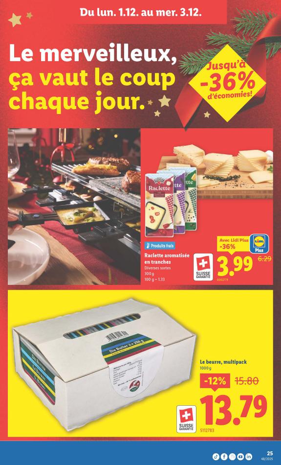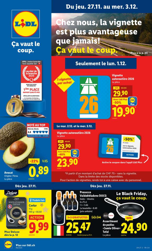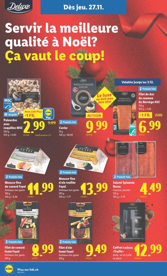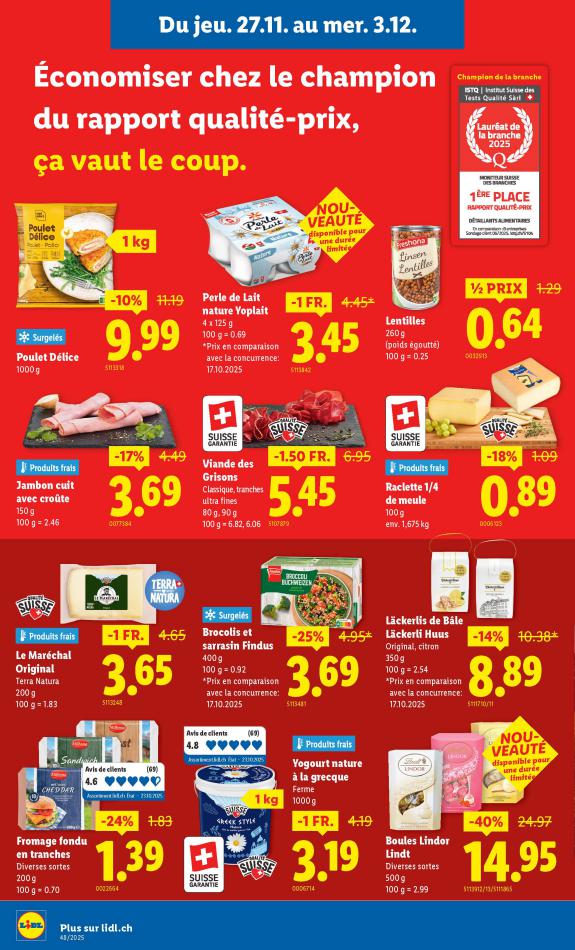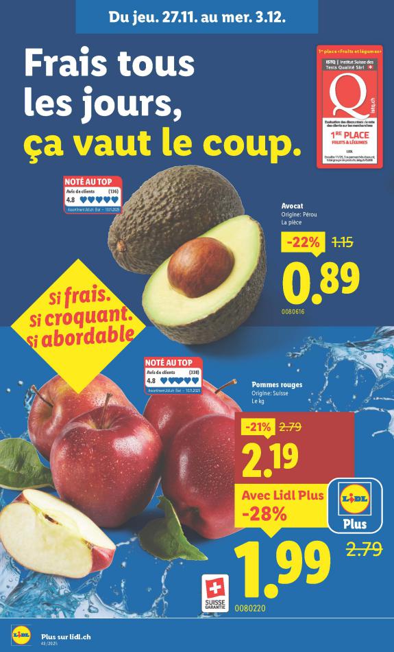 Vous trouverez ici toutes les ⚡ informations concernant les offres Lidl en cours, assortiment ainsi que horaire d'ouverture. Voir folder des promotions valable de 27 novembre au 03 décembre, vérifier les heures d'ouverture et adresses du réseau des magasins Lidl. Retrouvez les promotions et folders de Lidl maintenant et créez votre sélection des produits. ⚡ Ne ratez aucune bonne affaire et préparez vos achats en ligne. Faites vos économies pendant toute l'année et restez informé des dernières offres et remises chez Lidl.